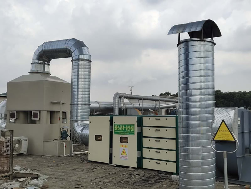 在车间机器产生废气的具体部位加上密闭系统,然后安装相对应的管道,利用风机作用将废气抽出;另外,一方面在车间四周的地面部位安装一定量的鼓风机,将车间内散布的废气由下而上鼓气,另一方面在车间顶部安装抽风机,使抽气量大于鼓风量,从而使车间产生一定的微负压,保证了车间内废气不会向外扩散。根据现场实际情况分析及十余年的橡胶行业废气处理工程实施经验,采取废气处理措施:将上海蒙杰塑料的废气通过收集装置收集送入支管道,再通过支管道送入主管道,然后送入水喷淋和光氧催化设备,通过后端风机抽风高空达标排放。
